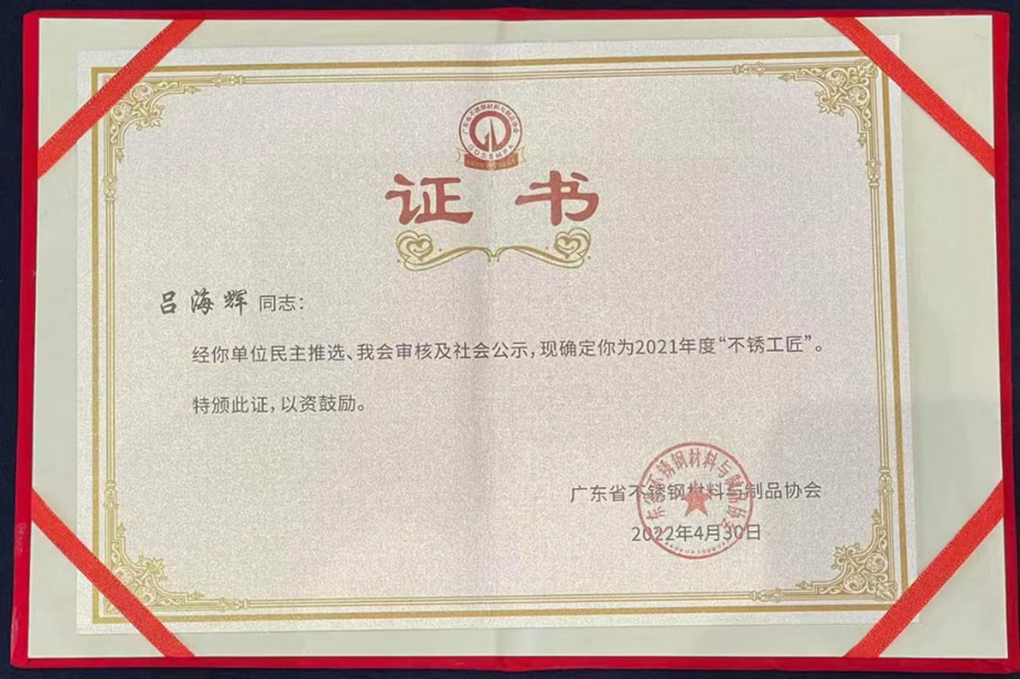 隨著《關(guān)于確認(rèn)2021年度“不銹工匠”公示名單的決定》的宣讀,儀式走向了高潮,協(xié)會(huì)領(lǐng)導(dǎo)分批為一個(gè)個(gè)“不銹工匠”頒發(fā)證書和紀(jì)錄品。(如下圖)